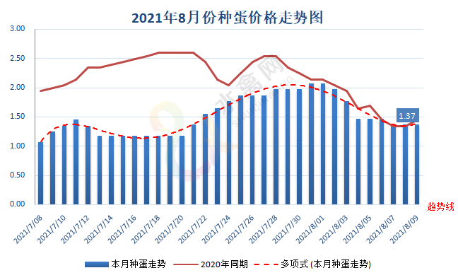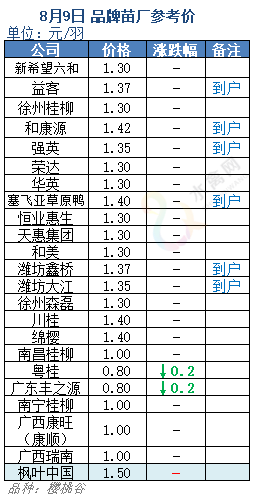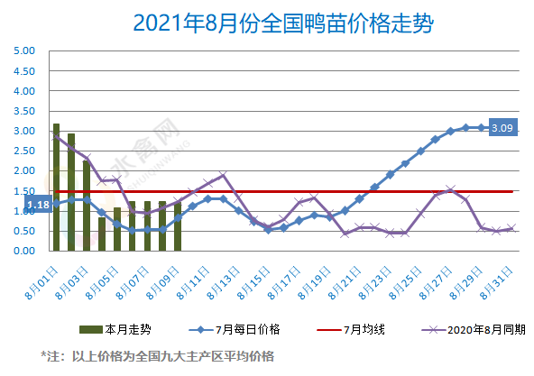 最新行情:明日全国鸭苗行情大稳小动、局部微跌。除南方广东价格下调0.2元/羽外,其他区域暂稳。近期苗价再遭暴跌,其中8月3日北苗的单日跌幅高达1.6元/羽,三天内南北方累计下调幅度1.9-2.5元/羽不等,目前各地苗价在经历大跌之后初步企稳。全国监测区域鸭苗成交均价1.21元/羽,较去年8月同期上涨0.03元/羽,涨幅2.5%,环比7月下跌0.26元/羽。