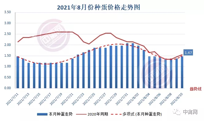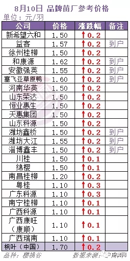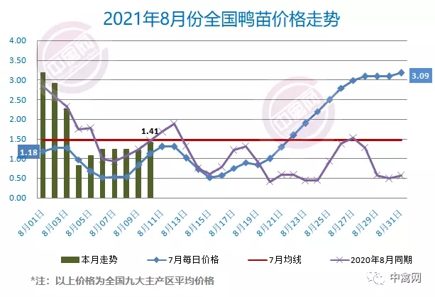 最新行情:明日上游端鸭苗、种蛋(品种:樱桃谷)行情试探高报、全线上涨,各区域主流孵化厂家开票报价上调0.1-0.3元/羽不等。近期苗价巨幅震荡、再遇暴跌,其中8月3日北苗的单日跌幅高达1.6元/羽,三天内南北方的累计下调幅度1.9-2.5元/羽不等,目前各地苗价在经历暴跌之后初步企稳。全国监测区域鸭苗成交均价1.41元/羽,较去年8月同期上涨0.23元/羽,涨幅19.5%,环比7月下跌0.06元/羽。