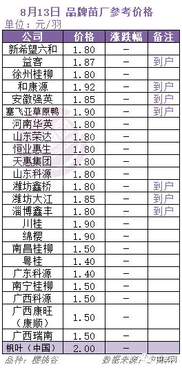 麻鸭、番鸭等其他品种方面,近期行情超跌反弹、全线回升,今天各地麻鸭、泥鸭苗报价上调0.1-0.2元/羽。监测厂家数据,麻鸭苗各地实发价1.8-3.0元/羽区间;半番苗主销价参考2.6-2.7元/羽。详情参见下表: