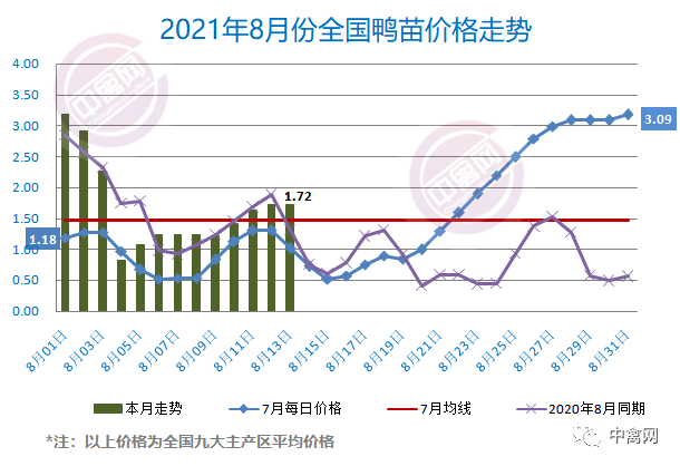 最新行情:明日上游端鸭苗、种蛋(品种:樱桃谷)行情不破不立、横盘暂稳,各区域主流孵化厂家开票报价不动。全国监测区域鸭苗成交均价1.72元/羽,较去年8月同期上涨0.54元/羽,涨幅45.8%,环比7月上涨0.25元/羽。