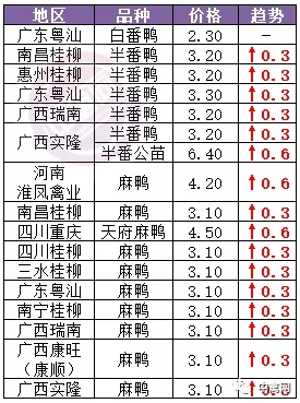 麻鸭、番鸭等其他品种方面,近期行情狂飙大涨、加速反弹,今天各地泥鸭、麻鸭苗报价上调0.3-0.6元/羽不等。监测厂家数据,麻鸭苗各地实发价已飙升至3.1-4.5元/羽区间;半番苗主销价参考3.2-3.3元/羽。详情可参见下表: