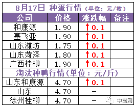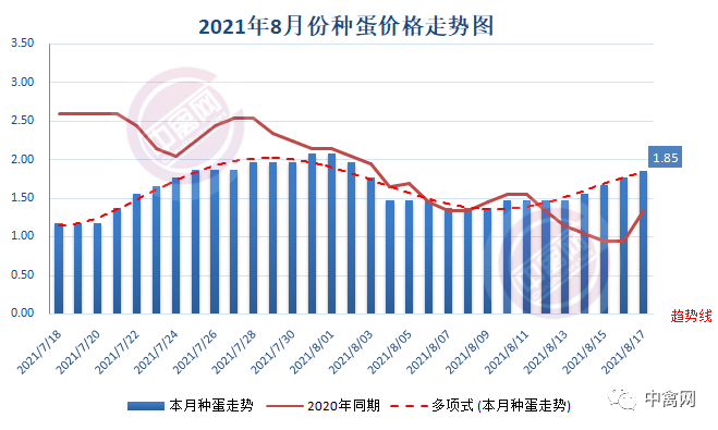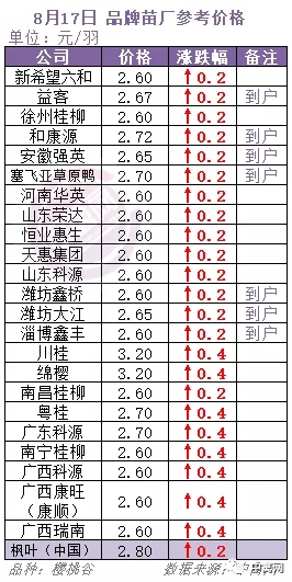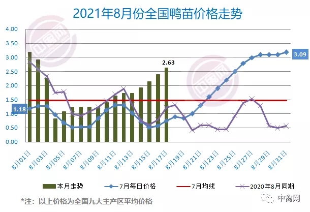 最新行情:明日上游端鸭苗、种蛋(品种:樱桃谷)行情V型反转、节节向上,各区域主流孵化厂家参考报价大涨0.2-0.4元/羽,其中西南川渝地区发苗价已重上3元。全国监测区域鸭苗成交均价2.63元/羽,较去年8月同期上涨1.45元/羽,涨幅122.9%,环比7月上涨1.16元/羽。