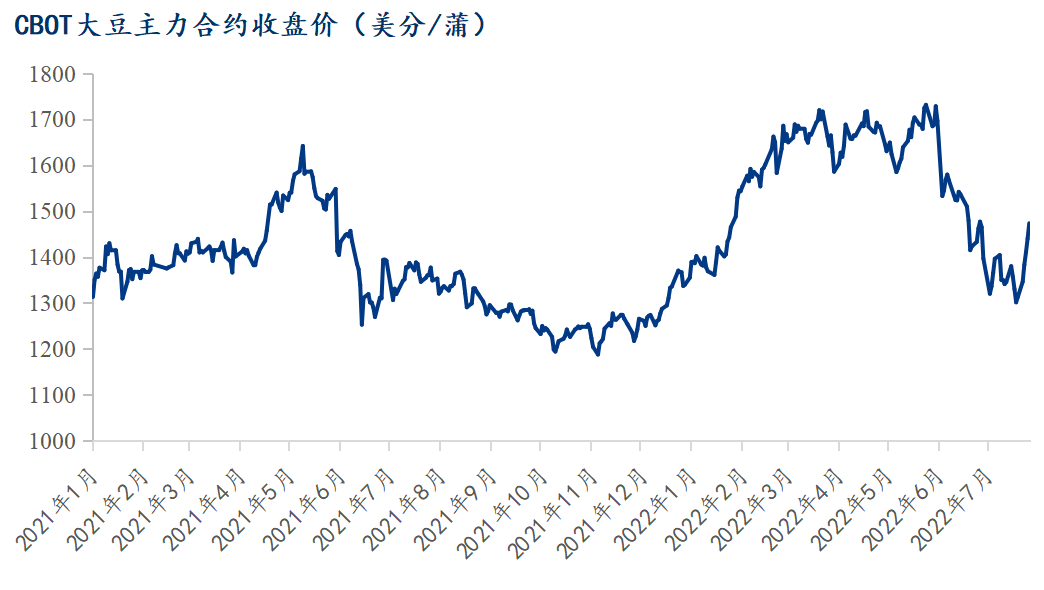 纵观整个7月CBOT大豆主力11月合约期价走势,基本上可以分为两个阶段,第一阶段为月初至7月21日的下跌走势;第二阶段为7月22日至月底的单边上涨走势。第一阶段CBOT大豆11月合约期价在经历6月底的短暂反弹后,月初再次出现连续大跌,令CBOT大豆11月合约快速触及1300美分/蒲附近,随后紧接着反弹,但反弹后重回下跌走势,在7月21日其期价再度跌至1300美分/蒲。其中主要原因:一方面受累于宏观形势的压制,因美联储的加息进程预期令整个大宗商品价格承压,CBOT大豆同样不例外。同时CBOT大豆上的投机资金出现连续大幅撤出,令CBOT大豆期价承压明显。另一方面因这时期的美国大豆出口数据一度表现疲软,且大豆出现洗船事件,令本就装运偏慢的美国大豆出口预期发生变化,导致CBOT大豆期价承受压力。此外,这时期CBOT大豆一度试图注入天气升水,但美国大豆主产区的降雨情况未让天气市题材充分交易起来。