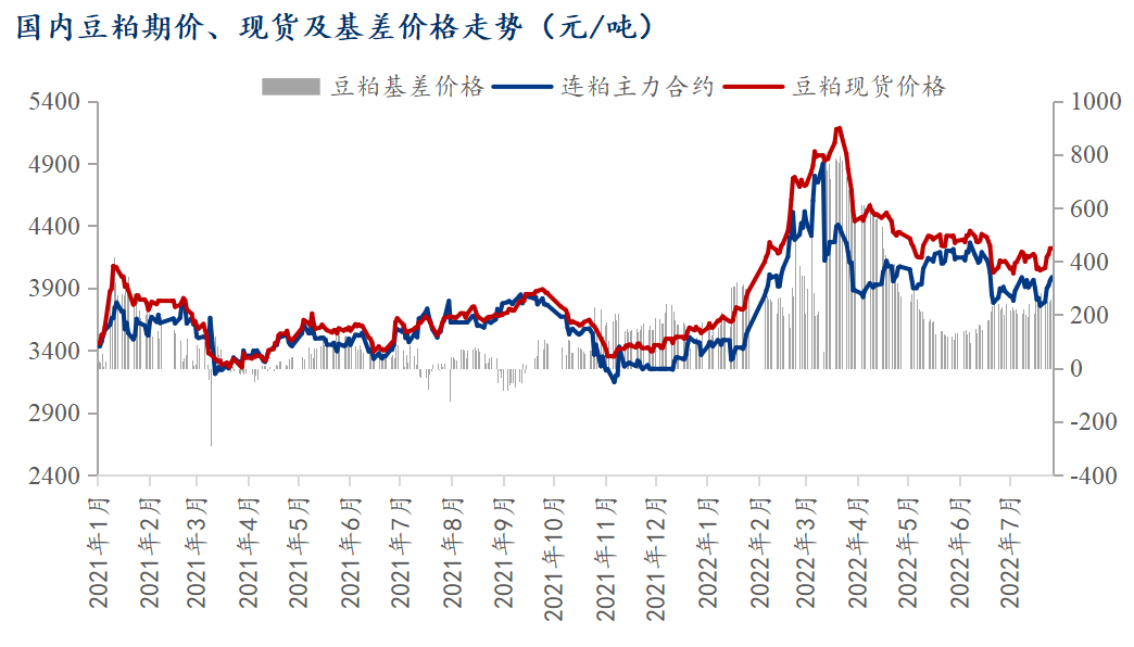 7月份的豆粕现货市场方面。据ysteel农产品数据显示,截至7月29日全国豆粕成交均价4223元/吨,月涨110元/吨,涨幅2.67%。整体来看,7月份国内豆粕现货价格运行区间偏窄,高低价差仅在150元/吨左右。豆粕现货基差价格方面,7月份豆粕现货基差价格表现坚挺,全月全国豆粕现货基差均价233元/吨,月涨61元/吨,涨幅35%。7月份豆粕现货基差价格保持坚挺的主要原因在于:伴随着进口大豆库存后期有望逐步去库存,同时豆粕库存见顶回落。令油厂在面对8-9月进口大豆到港量偏少,且10-1月豆粕销售难度大,进口大豆采购慢的局面,提前对豆粕基差价格持续挺价,甚至部分油厂出现惜售的行为。而中下游企业虽整体保持偏低的渠道库存,但基本的需求肯定在,同时一度因豆粕现货价格靠近4000元/吨,导致豆粕相比其它杂粕性价比凸显,在饲料中的添加比例出现上调。