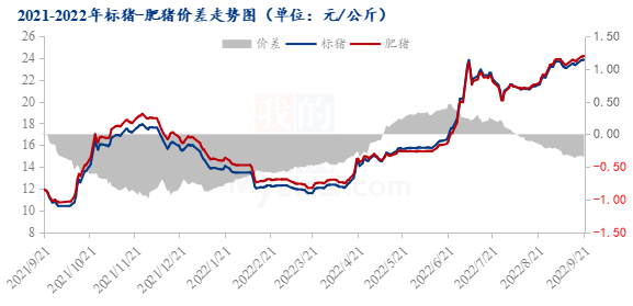 目前节假日(十一国庆节)+旺季消费在即,现货价格随着期货价格下跌到22.75元/公斤的难度较大,原因还是二次育肥+标肥价差增大对现货市场形成强有力的支撑,传统的消费旺季到来,不管是养殖端还是屠宰端还是贸易端还是抱有很大的期盼的。