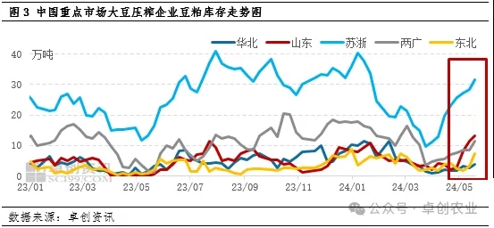 目前在原料大豆供应充足支撑下,国内上游企业处于累库阶段,多数区域市场供需关系宽松。卓创资讯监测数据显示,截至5月24日,山东重点大豆压榨企业豆粕库存为13.20万吨,周环比增加1.90万吨;东北为7.42万吨,周环比增加4.32万吨;苏浙为31.40万吨,周环比增加3.00万吨。各区域豆粕库存皆在累积,而需求表现相对一般,提货整体欠佳,导致部分企业出现催提乃至胀库停机现象。在此情况下,区域价差有所走低,区域间货源流动条件不足,山东货物流出受到限制,而供应端增量反馈到豆粕现货价格上影响偏空。