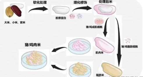 该团队巧妙利用鸡、猪肌肉和脂肪细胞的贴壁生长特性,将大米、小米及紫米预处理后,创造性地作为细胞生长的支架。这一创新不仅为细胞提供了一个理想的微环境,还在细胞增殖和分化的过程中,形成了一种营养全面且成分可精确控制的组合食品。