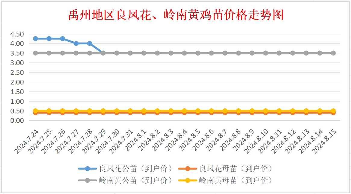 良凤花鸡苗:价格稳定,公苗到户价3.00-4.00元/羽,母苗到户价0.40元/羽,稳。