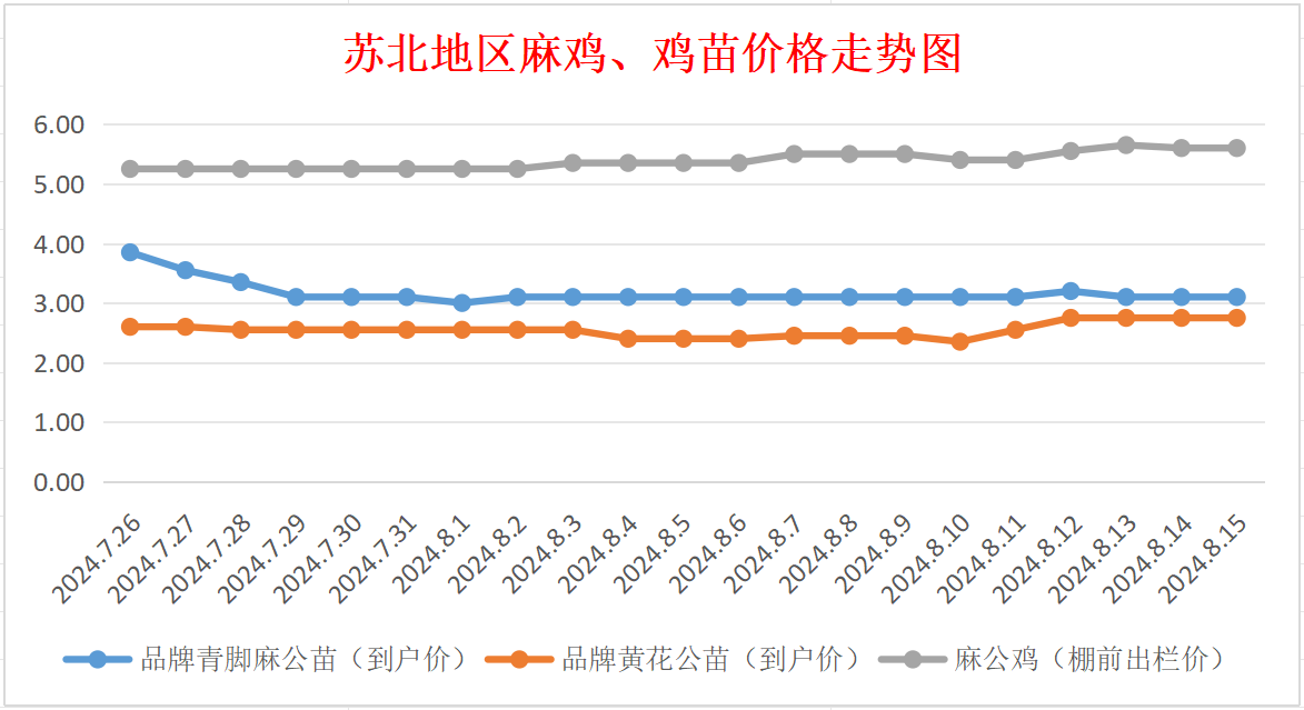品牌青脚麻公苗(多品种快大型):价格稳定,到户价3.00-3.20元/羽,稳;品种、区域略为有差异。