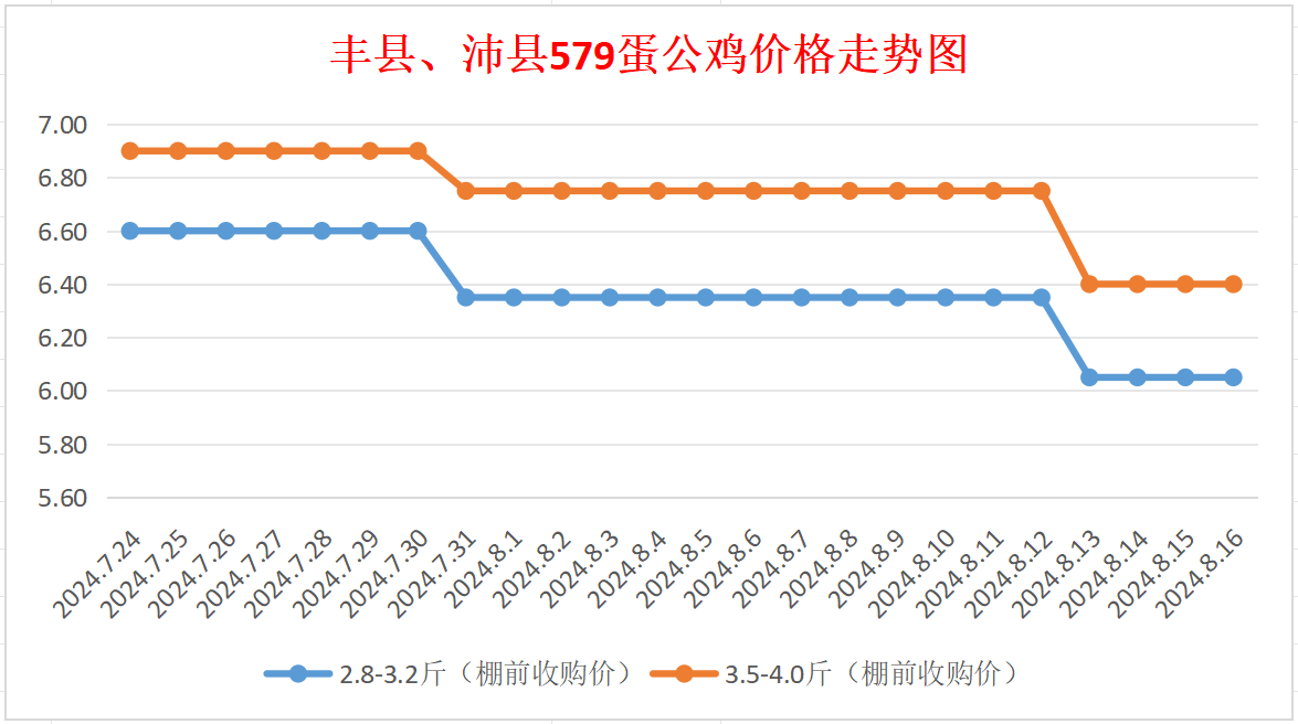 579蛋公鸡:价格稳定,棚前收购主流价2.8-3.2斤重5.90-6.20元/斤,3.5-4.0斤重6.30-6.50元/斤,稳;实际价格以成交为准。
