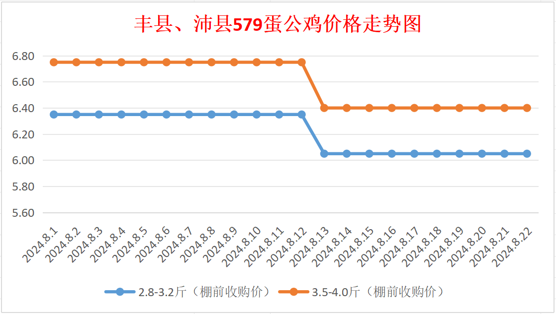 579蛋公鸡:价格稳定,棚前收购主流价2.8-3.2斤重5.90-6.20元/斤,3.5-4斤重6.30-6.50元/斤,稳;实际价格以成交为准。
