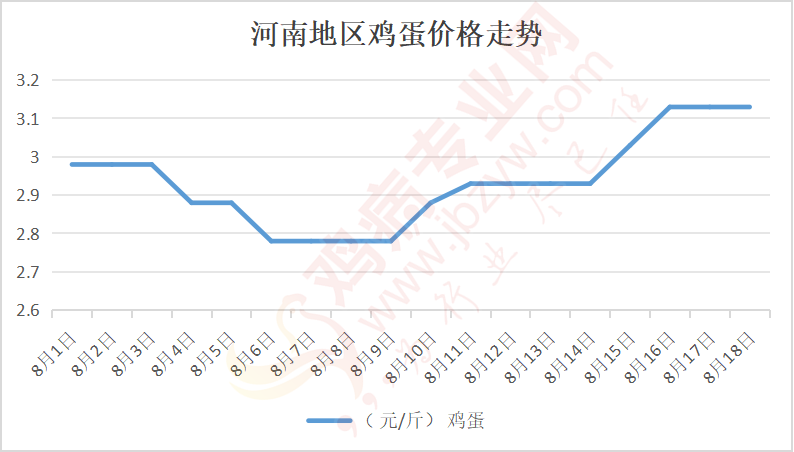 鸡病专业网消息:8月18日,河南郑州鸡蛋3.15元/斤,稳;新密鸡蛋3.15元/斤,稳;荥阳鸡蛋3.15元/斤,稳;中牟鸡蛋3.15元/斤,稳;周口鸡蛋3.1元/斤,稳;商丘鸡蛋93元/30斤,稳;鹤壁鸡蛋3.1元/斤,稳;汝州鸡蛋3.1元/斤,稳;开封鸡蛋93元/30斤,稳;漯河鸡蛋3.1元/斤,稳;漯河临颍鸡蛋3.1元/斤,稳;许昌鸡蛋3.1元/斤,稳;南阳鸡蛋3.1元/斤,稳;南阳邓州鸡蛋3.1元/斤,稳;新乡鸡蛋3.1元/斤,稳;安阳鸡蛋3.1元/斤,稳;新郑鸡蛋3.15元/斤,稳;登封鸡蛋3.15元/斤,稳;平顶山鸡蛋3.1元/斤,稳;驻马店鸡蛋3.15元/斤,稳;三门峡鸡蛋3.1元/斤,稳;焦作鸡蛋3.1元/斤,稳;信阳鸡蛋3.1元/斤,稳;濮阳鸡蛋3.1元/斤,稳。