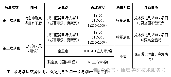 1.6、建议:鸡群出栏5天内完成鸡舍彻底冲刷,次日进行第一次舍内消毒和舍外消毒,第一次消毒后才是有效空舍期,有效空舍期建议7天。