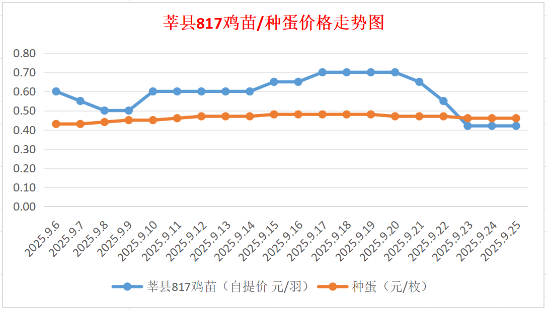 817鸡苗(混合):报价自提0.42元/羽。(稳)