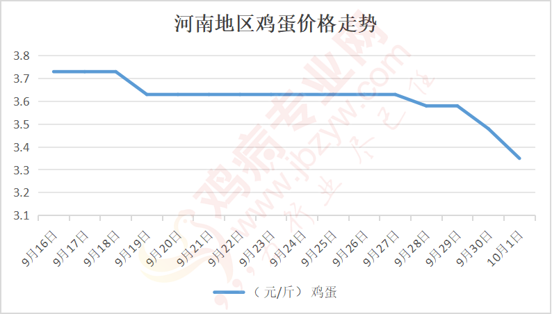 鸡病专业网消息:10月1日,河南郑州鸡蛋3.4元/斤,落;新密鸡蛋3.4元/斤,落;荥阳鸡蛋3.4元/斤,落;中牟鸡蛋3.4元/斤,落;周口鸡蛋3.3元/斤,落;商丘鸡蛋100元/30斤,落;鹤壁鸡蛋3.3元/斤,落;汝州鸡蛋3.3元/斤,落;开封鸡蛋100元/30斤,落;漯河鸡蛋3.3元/斤,落;漯河临颍鸡蛋3.3元/斤,落;许昌鸡蛋3.3元/斤,落;南阳鸡蛋3.3元/斤,落;南阳邓州鸡蛋3.3元/斤,落;新乡鸡蛋3.3元/斤,落;安阳鸡蛋3.3元/斤,落;新郑鸡蛋3.4元/斤,落;登封鸡蛋3.4元/斤,落;平顶山鸡蛋3.35元/斤,落;驻马店鸡蛋3.35元/斤,落;三门峡鸡蛋3.35元/斤,落;焦作鸡蛋3.3元/斤,落;信阳鸡蛋3.3元/斤,落;濮阳鸡蛋3.3元/斤,落。