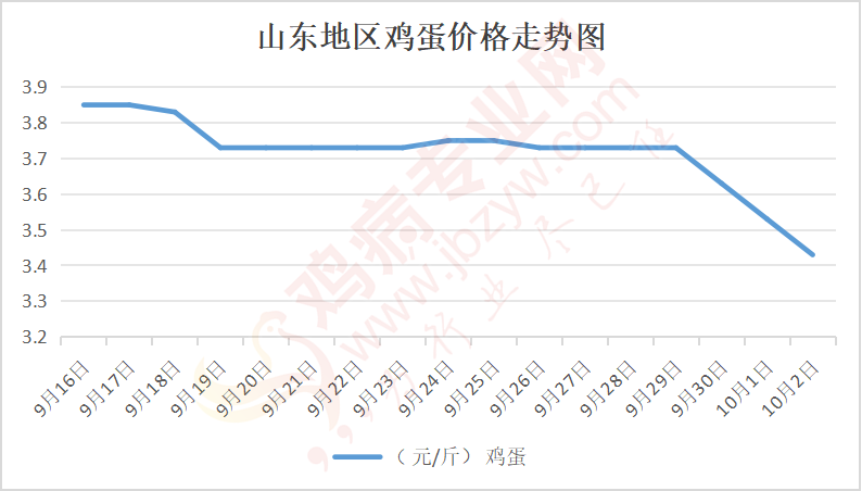 鸡病专业网消息:10月2日,山东地区莱阳鸡蛋3.45元/斤,落;青岛鸡蛋3.45元/斤,落;诸城鸡蛋3.5元/斤,落;安丘鸡蛋3.4元/斤,落;昌乐鸡蛋3.4元/斤,落;寿光鸡蛋3.4元/斤,落;昌邑鸡蛋3.4元/斤,落;高密鸡蛋3.5元/斤,落;青州鸡蛋3.4元/斤,落;临朐鸡蛋3.4元/斤,落;莱州鸡蛋3.45元/斤,落;威海鸡蛋3.45元/斤,落;临沭鸡蛋3.35元/斤,落;沂水鸡蛋3.35元/斤,落;沂南鸡蛋3.35元/斤,落;莒南鸡蛋3.35元/斤,落;兰陵县鸡蛋3.35元/斤,落;日照鸡蛋3.35元/斤,落;莒县鸡蛋3.35元/斤,落;日照辛萁商贸鸡蛋3.35元/斤,落;泗水鸡蛋价格98元/30斤,落;济宁、汶上鸡蛋价格98元/30斤,落;梁山、东平红蛋价格98元/30斤,落;枣庄滕州地区鸡蛋混码主流到户99元/30斤,落;泰安地区新泰鸡蛋价格98元/30斤,落;菏泽地区曹县主流到户98元/30斤,落;成武鸡蛋价格98元/30斤,落;单县到户98元/30斤,落;聊城莘县96元/30斤,落。