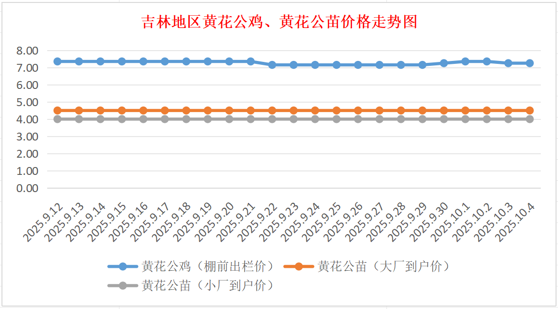 黄花公苗:价格稳定,大厂到户价4.50元/羽,小厂到户价4.00元/羽,稳。