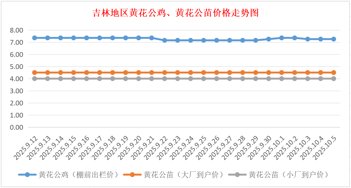 黄花公苗:价格稳定,大厂到户价4.50元/羽,小厂到户价4.00元/羽,稳。