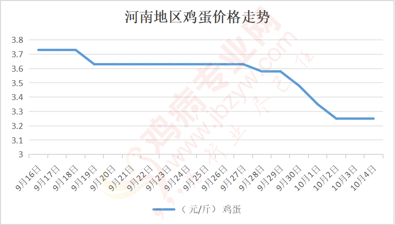 鸡病专业网消息:10月4日,河南郑州鸡蛋3.3元/斤,稳;新密鸡蛋3.3元/斤,稳;荥阳鸡蛋3.3元/斤,稳;中牟鸡蛋3.3元/斤,稳;周口鸡蛋3.2元/斤,稳;商丘鸡蛋97元/30斤,稳;鹤壁鸡蛋3.2元/斤,稳;汝州鸡蛋3.2元/斤,稳;开封鸡蛋97元/30斤,稳;漯河鸡蛋3.2元/斤,稳;漯河临颍鸡蛋3.2元/斤,稳;许昌鸡蛋3.2元/斤,稳;南阳鸡蛋3.2元/斤,稳;南阳邓州鸡蛋3.2元/斤,稳;新乡鸡蛋3.2元/斤,稳;安阳鸡蛋3.2元/斤,稳;新郑鸡蛋3.3元/斤,稳;登封鸡蛋3.3元/斤,稳;平顶山鸡蛋3.25元/斤,稳;驻马店鸡蛋3.25元/斤,稳;三门峡鸡蛋3.25元/斤,稳;焦作鸡蛋3.2元/斤,稳;信阳鸡蛋3.2元/斤,稳;濮阳鸡蛋3.2元/斤,稳。