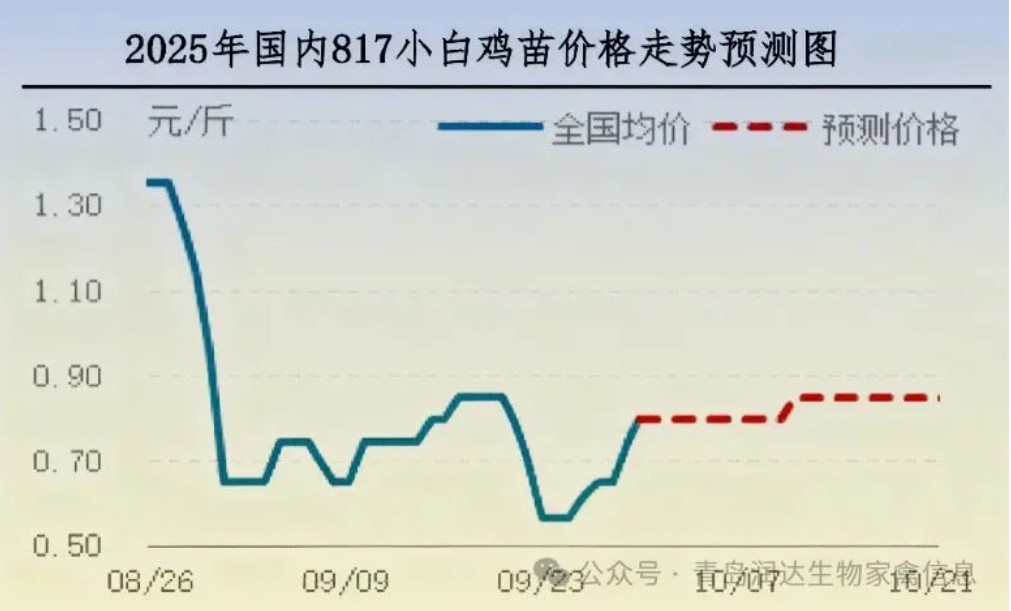 双节假期后,苗量供应不大,养殖户补栏心态趋于平稳,但毛鸡价格或偏弱运行,届时鸡苗价格或走强,但涨幅有限。预计未来三周817小白鸡苗价格先稳后涨。