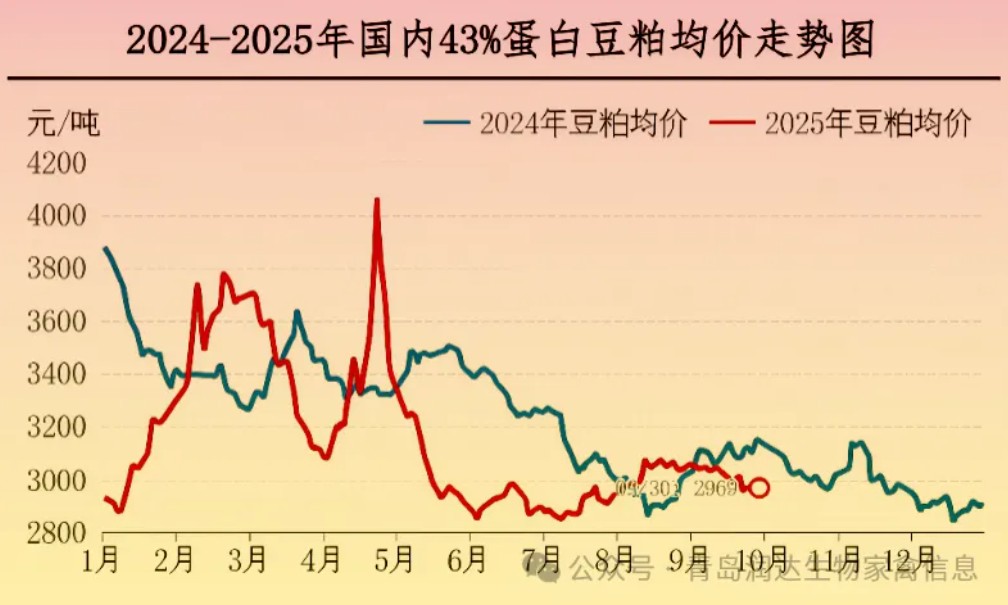 本周全国43%蛋白豆粕周度均价2962元/吨,与上周均价相比,下跌13元/吨,跌幅0.44%。