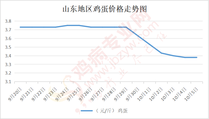 鸡病专业网消息:10月5日,山东地区莱阳鸡蛋3.35元/斤,稳;青岛鸡蛋3.35元/斤,稳;诸城鸡蛋3.4元/斤,稳;安丘鸡蛋3.35元/斤,稳;昌乐鸡蛋3.35元/斤,稳;寿光鸡蛋3.35元/斤,稳;昌邑鸡蛋3.35元/斤,稳;高密鸡蛋3.4元/斤,稳;青州鸡蛋3.35元/斤,稳;临朐鸡蛋3.35元/斤,稳;莱州鸡蛋3.35元/斤,稳;威海鸡蛋3.35元/斤,稳;临沭鸡蛋3.35元/斤,稳;沂水鸡蛋3.35元/斤,稳;沂南鸡蛋3.35元/斤,稳;莒南鸡蛋3.35元/斤,稳;兰陵县鸡蛋3.35元/斤,稳;日照鸡蛋3.35元/斤,稳;莒县鸡蛋3.35元/斤,稳;日照辛萁商贸鸡蛋3.35元/斤,稳;泗水鸡蛋价格98元/30斤,稳;济宁、汶上鸡蛋价格98元/30斤,稳;梁山、东平红蛋价格98元/30斤,稳;枣庄滕州地区鸡蛋混码主流到户99元/30斤,稳;泰安地区新泰鸡蛋价格98元/30斤,稳;菏泽地区曹县主流到户98元/30斤,稳;成武鸡蛋价格98元/30斤,稳;单县到户98元/30斤,稳;聊城莘县96元/30斤,稳。