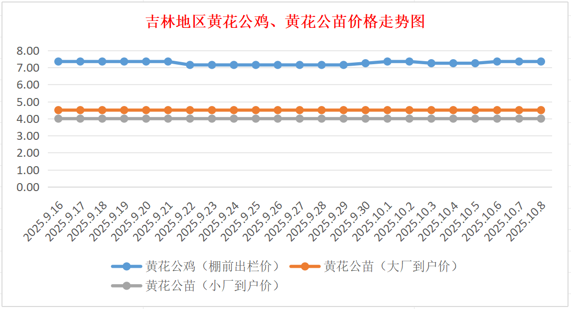 黄花公苗:价格稳定,大厂到户价4.50元/羽,小厂到户价4.00元/羽,稳。