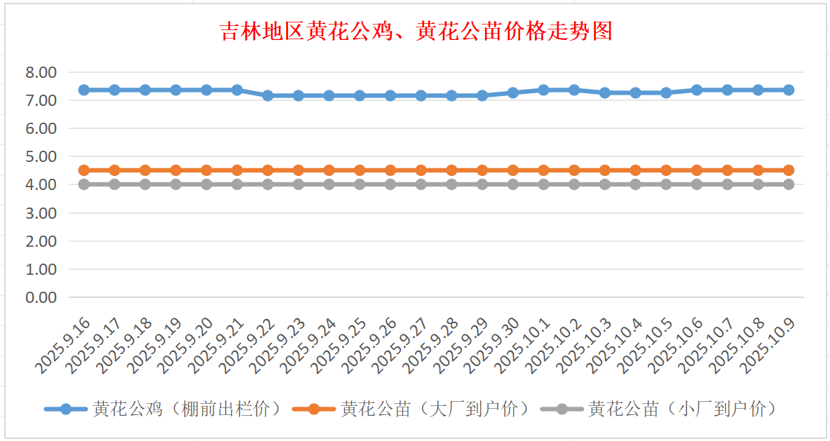 黄花公苗:价格稳定,大厂到户价4.50元/羽,小厂到户价4.00元/羽,稳。