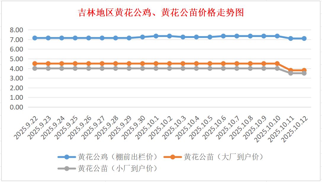 黄花公苗:价格稳定,大厂到户价3.80元/羽,小厂到户价3.50元/羽,稳。