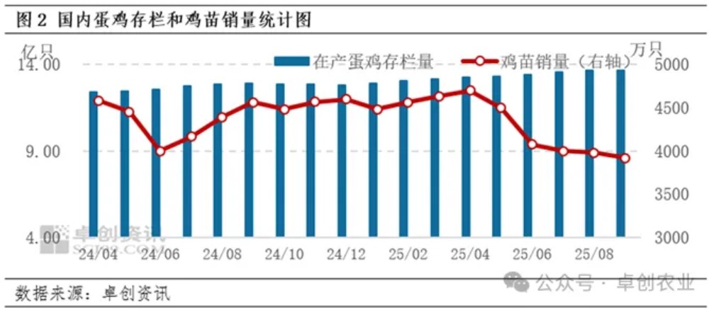 鸡苗销量持续减少,后备蛋鸡存栏占比继续压缩。9月后备蛋鸡占比下滑,主要受到鸡苗销量影响。2025年蛋鸡鸡苗销量呈先增后减趋势,其中1-4月鸡苗销量呈增加趋势,5-9月鸡苗销量开启下行通道,鸡苗销量持续下滑,9月鸡苗销量环比跌幅超过1.50%,导致后备蛋鸡群体中新增量小于减少量,因此9月后备蛋鸡存栏占比呈压缩局面,占比环比减少0.26个百分点。