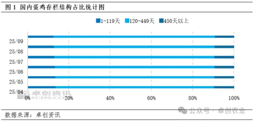 【导语】受新增产能释放与养殖户阶段性惜售情绪转淡影响,2025年9月蛋鸡存栏结构继续呈现两端减少,中间扩大趋势。后备蛋鸡(120日龄以下)存栏以及待出栏老母鸡(450日龄以上)存栏占比均下降,仅主产蛋鸡(120-450日龄)存栏占比提升。10月鸡苗销量预期减少,同时老母鸡出栏数量存进一步增加可能,届时蛋鸡存栏结构或呈主产阶段增加的趋势。
