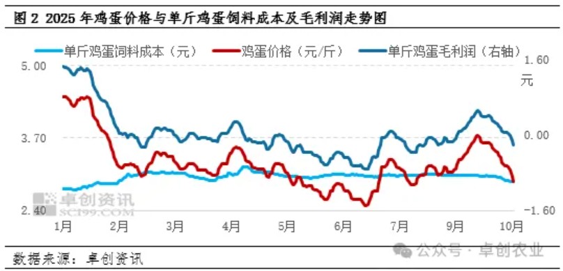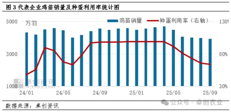 从三季度蛋鸡苗价格运行轨迹来看,7月至9月鸡苗价格逐月走低,未出现明显反弹迹象,表明市场整体处于偏弱的格局。从供应端来看,前期种鸡存栏规模稳步恢复,特别是部分新父母代种鸡产能陆续释放,导致商品代蛋鸡苗供应相对宽松。从需求端来看,9月份虽养殖盈利状况有所改善,实现扭亏为盈,但受7-8月持续亏损拖累,三季度单斤鸡蛋平均利润为-0.09元,这种盈利情况难以有效提振养殖企业的补栏积极性,导致多数养殖企业采取观望策略,补栏决策趋于理性,鸡苗需求量逐渐下降。据卓创资讯监测数据显示,三季度代表企业鸡苗总销量环比减少10.34%。综合来看,三季度鸡苗市场呈现终端消费需求疲软、供给相对充足、市场情绪谨慎等多重因素共同作用,利空鸡苗价格,呈现不断下行态势。