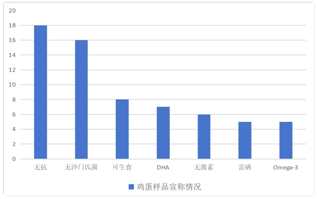 试验人员从电商平台和线下商超共购买了30款鸡蛋样品,价格在3.7-50.2元/斤不等,主要分为七种,包括“无抗”(18款)、“无沙门氏菌”(16款)、“可生食”(8款)、“DHA”(7款)、“无激素”(6款)、“富硒”(5款)、“Omega-3”(5款)。