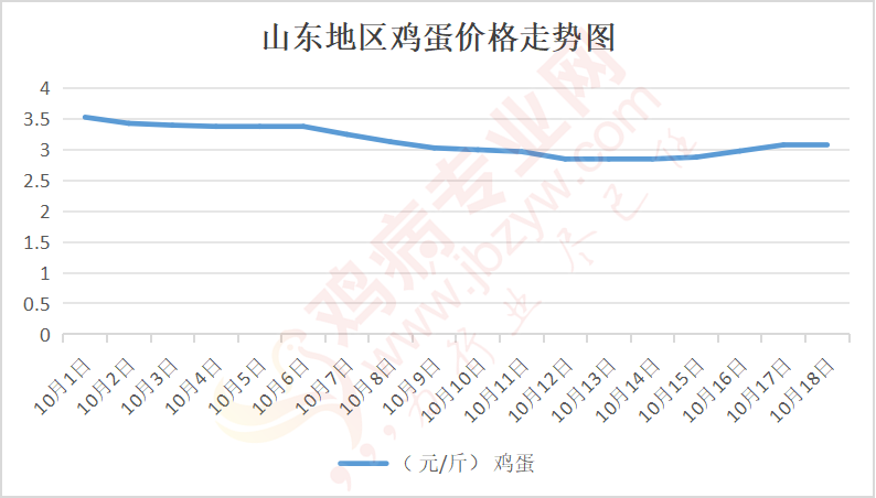 鸡病专业网消息:10月18日,山东地区莱阳鸡蛋3.15元/斤,稳;青岛鸡蛋3.15元/斤,稳;诸城鸡蛋3.1元/斤,稳;安丘鸡蛋3元/斤,稳;昌乐鸡蛋3元/斤,稳;寿光鸡蛋3元/斤,稳;昌邑鸡蛋3元/斤,稳;高密鸡蛋3.1元/斤,稳;青州鸡蛋3元/斤,稳;临朐鸡蛋3元/斤,稳;莱州鸡蛋3.15元/斤,稳;威海鸡蛋3.15元/斤,稳;临沭鸡蛋2.9元/斤,稳;沂水鸡蛋2.9元/斤,稳;沂南鸡蛋2.9元/斤,稳;莒南鸡蛋2.9元/斤,稳;兰陵县鸡蛋2.9元/斤,稳;日照鸡蛋2.9元/斤,稳;莒县鸡蛋2.9元/斤,稳;日照辛萁商贸鸡蛋2.9元/斤,稳;泗水鸡蛋价格87元/30斤,稳;济宁、汶上鸡蛋价格87元/30斤,稳;梁山、东平红蛋价格87元/30斤,稳;枣庄滕州地区鸡蛋混码主流到户89元/30斤,稳;泰安地区新泰鸡蛋价格87元/30斤,稳;菏泽地区曹县主流到户87元/30斤,稳;成武鸡蛋价格87元/30斤,稳;单县到户87元/30斤,稳;聊城莘县85元/30斤,稳。