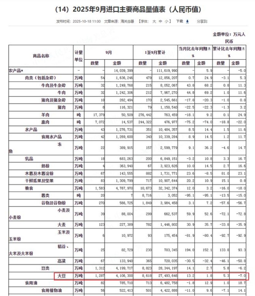 在国内市场,从官方数据显示,2025年9月份,国内进口大豆达到1287万吨,1-9月份,进口大豆规模达到了8618万吨,9月大豆进口同比去年增加13.2%,环比8月增加4.8%,进口大豆显著增加,1-9月份大豆进口同比增幅在5.3%,但是,费用同比下降7%,进口大豆成本回落!