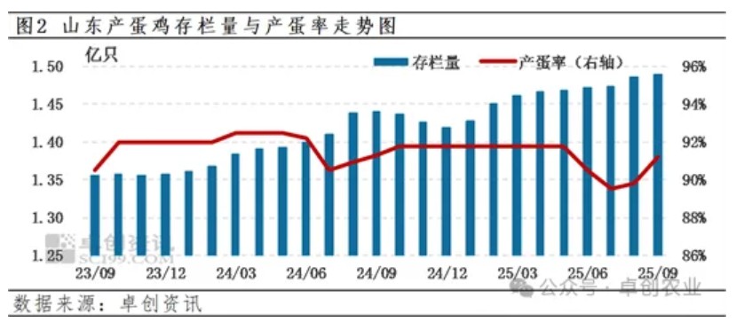 2025年蛋鸡养殖长期低于成本线,9月份蛋价扭亏为盈后养殖单位淘汰老鸡积极性普遍低于前期预期,老母鸡出栏量增幅不大,去产能速度较慢,存栏拐点未至。截至9月底,山东市场产蛋鸡存栏量增至1.49亿只。10月份部分养殖单位抵触低价老母鸡,有惜售盼涨心理,出栏量仍不多,而新开产蛋鸡虽环比减少,但仍处高位,10月份去产能速度仍不快。目前山东市场产蛋鸡存栏量仍维持高位,叠加产蛋率恢复,鸡蛋产量较为充足,市场供应压力较大,利空鸡蛋价格。