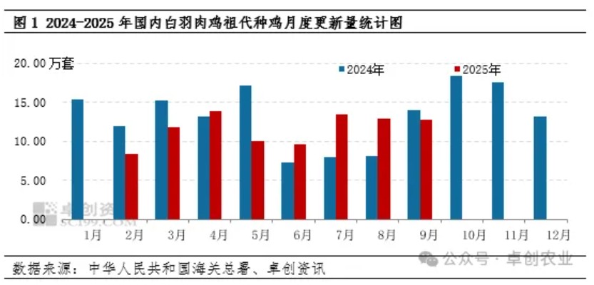 据卓创资讯调研,四季度国内自繁品种更新积极性或提升,更新量或环比增加,或在20.00万套左右;三季度起法国的供种能力提升,企业单批次引种量可达1.40万套,且月度引种企业多为3-4家,因此四季度祖代种鸡引种量或在20.00万套左右。综合引种及国内自繁来看,2025年国内祖代种鸡总更新量或在130.00万套左右。