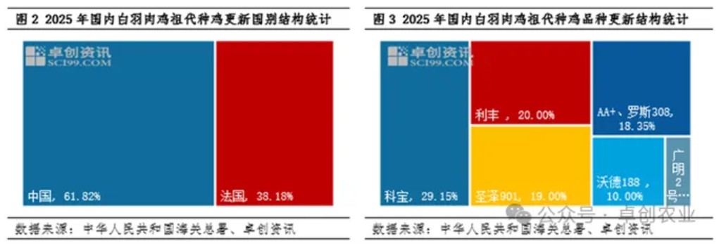 据卓创资讯数据统计,2025年我国白羽肉鸡祖代种鸡的供种国由2024年的美国、新西兰和中国变更为法国和中国,其中1-9月来自法国的祖代种鸡数量仅有35.46万套,占比38.18%,和2024年1-9月的引种量相比减少29.08%;来自中国的祖代种鸡数量为57.42万套,占比61.82%,和2024年同期相比减少57.42%。一方面,供种国数量减少,且法国的祖代种鸡主要供欧洲,对中国的供种能力不及美国和新西兰,使得引种量减少;另一方面,国内自繁祖代种鸡企业多注重品种研发,主动减少更新量。两方面综合作用下,1-9月祖代种鸡引种量及国内自繁量均同比减少。