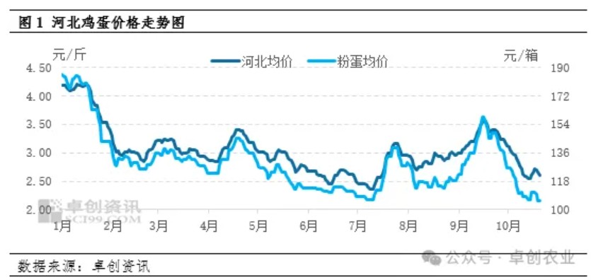 【导语】10月中上旬受到供应充足、需求减弱、持续降雨等多方面利空因素影响,河北蛋价快速跌至低位。下旬供需宽松格局暂难改变,但价格已处较低水平,继续下跌亦存阻力,河北蛋价或低位横盘震荡为主。