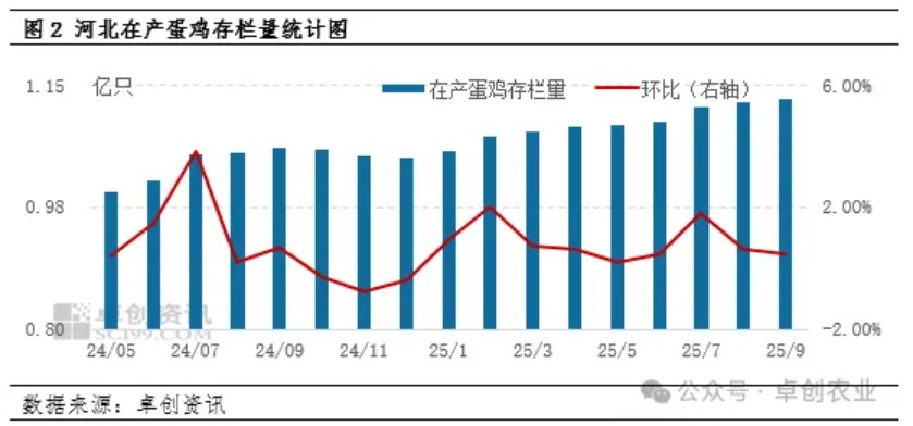 9月份河北地区养殖单位出栏老母鸡积极性虽然提升,但是受到养殖盈利提升影响,出栏增幅不及预期,加之新开产蛋鸡数量仍处高位,9月河北在产蛋鸡存栏量继续增至1.13亿只,环比增幅0.44%,处于较高水平,鸡蛋供应较为充足,供应方面持续施压。需求方面,月初正值“双节假期”,东莞市场多数停发,加之持续降雨天气,箱皮受潮,且南北方温差较大,鸡蛋易出质量问题,市场流通较为缓慢,根据卓创资讯监测数据显示,10月第二周河北样本周度发货量环比降幅超过10%,尤其粉蛋压力较大,蛋价跌势更为明显。节后下游陆续恢复采购,对行情略有支撑,但目前仍处节后需求低迷期,行情难有明显涨势。