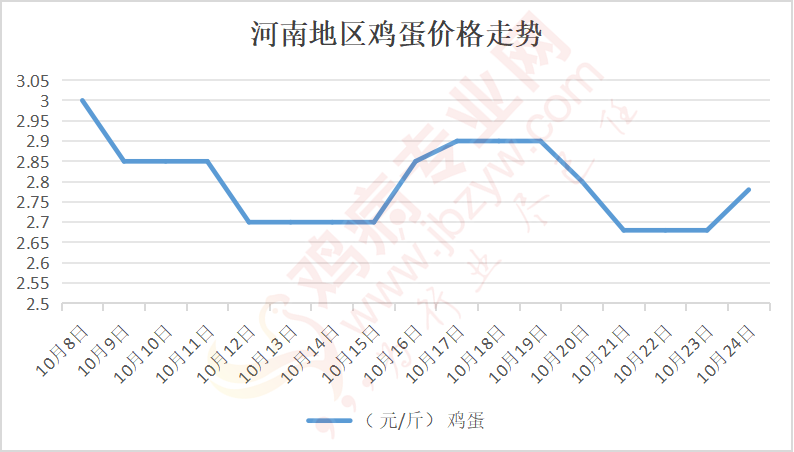 鸡病专业网消息:10月23日,河南郑州鸡蛋2.8元/斤,涨;新密鸡蛋2.8元/斤,涨;荥阳鸡蛋2.8元/斤,涨;中牟鸡蛋2.8元/斤,涨;周口鸡蛋2.75元/斤,涨;商丘鸡蛋84元/30斤,涨;鹤壁鸡蛋2.75元/斤,涨;汝州鸡蛋2.75元/斤,涨;开封鸡蛋83-84元/30斤,涨;漯河鸡蛋2.75元/斤,涨;漯河临颍鸡蛋2.75元/斤,涨;许昌鸡蛋2.8元/斤,涨;南阳鸡蛋2.75元/斤,涨;南阳邓州鸡蛋2.75元/斤,涨;新乡鸡蛋2.75元/斤,涨;安阳鸡蛋2.75元/斤,涨;新郑鸡蛋2.8元/斤,涨;登封鸡蛋2.8元/斤,涨;平顶山鸡蛋2.8元/斤,涨;驻马店鸡蛋2.8元/斤,涨;三门峡鸡蛋2.8元/斤,涨;焦作鸡蛋2.75元/斤,涨;信阳鸡蛋2.75元/斤,涨;濮阳鸡蛋2.75元/斤,涨。