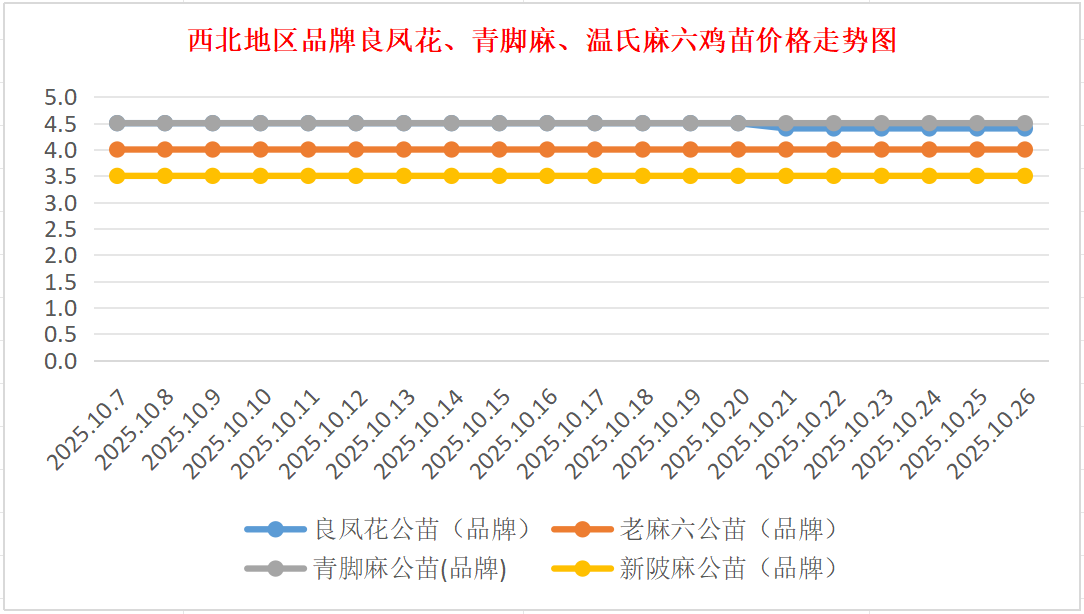品牌青脚麻公苗(多品种快大型):价格稳定,到户价4.50元/羽,稳。