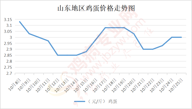 鸡病专业网消息:10月25日,山东地区莱阳鸡蛋3.1元/斤,稳;青岛鸡蛋3.1元/斤,稳;诸城鸡蛋3.1元/斤,稳;安丘鸡蛋2.9元/斤,稳;昌乐鸡蛋2.9元/斤,稳;寿光鸡蛋2.9元/斤,稳;昌邑鸡蛋2.9元/斤,稳;高密鸡蛋3.1元/斤,稳;青州鸡蛋2.9元/斤,稳;临朐鸡蛋2.9元/斤,稳;莱州鸡蛋3.1元/斤,稳;威海鸡蛋3.1元/斤,稳;临沭鸡蛋2.9元/斤,稳;沂水鸡蛋2.9元/斤,稳;沂南鸡蛋2.9元/斤,稳;莒南鸡蛋2.9元/斤,稳;兰陵县鸡蛋2.9元/斤,稳;日照鸡蛋2.9元/斤,稳;莒县鸡蛋2.9元/斤,稳;日照辛萁商贸鸡蛋2.9元/斤,稳;泗水鸡蛋价格84元/30斤,稳;济宁、汶上鸡蛋价格84元/30斤,稳;梁山、东平红蛋价格84元/30斤,稳;枣庄滕州地区鸡蛋混码主流到户86元/30斤,稳;泰安地区新泰鸡蛋价格84元/30斤,稳;菏泽地区曹县主流到户84元/30斤,稳;成武鸡蛋价格84元/30斤,稳;单县到户84元/30斤,稳;聊城莘县83元/30斤,稳。