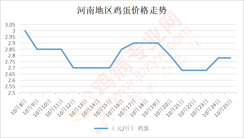 鸡病专业网消息:10月25日,河南郑州鸡蛋2.8元/斤,稳;新密鸡蛋2.8元/斤,稳;荥阳鸡蛋2.8元/斤,稳;中牟鸡蛋2.8元/斤,稳;周口鸡蛋2.75元/斤,稳;商丘鸡蛋84元/30斤,稳;鹤壁鸡蛋2.75元/斤,稳;汝州鸡蛋2.75元/斤,稳;开封鸡蛋83-84元/30斤,稳;漯河鸡蛋2.75元/斤,稳;漯河临颍鸡蛋2.75元/斤,稳;许昌鸡蛋2.8元/斤,稳;南阳鸡蛋2.75元/斤,稳;南阳邓州鸡蛋2.75元/斤,稳;新乡鸡蛋2.75元/斤,稳;安阳鸡蛋2.75元/斤,稳;新郑鸡蛋2.8元/斤,稳;登封鸡蛋2.8元/斤,稳;平顶山鸡蛋2.8元/斤,稳;驻马店鸡蛋2.8元/斤,稳;三门峡鸡蛋2.8元/斤,稳;焦作鸡蛋2.75元/斤,稳;信阳鸡蛋2.75元/斤,稳;濮阳鸡蛋2.75元/斤,稳。