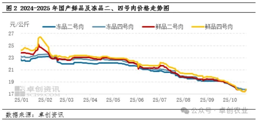 导致月内进口猪肉价格下跌的原因主要在于国产鲜品及冻品猪肉价格的持续下降。从图2看到,10月份国产鲜品猪肉价格快速探底,至10月中旬鲜品二、四号肉价格已跌至17.38元/公斤,较月初分别累计下跌7.33%、7.54%。10月下旬虽有反弹,但幅度有限,价格仍处于偏低水平。据卓创资讯统计,截至2025年10月24日,国内鲜品二号肉成交均价为17.71元/公斤,较月初下跌5.56%;鲜品四号肉成交均价为17.75元/公斤,较月初下跌5.54%;冻品二号肉成交均价为17.72元/公斤,较月初下跌5.03%;冻品四号肉成交均价为17.76元/公斤,较月初下跌5.30%。