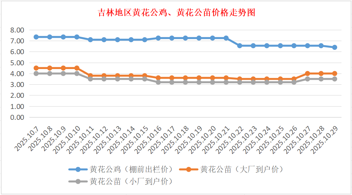 黄花公苗:价格稳定,大厂到户价4.00元/羽,小厂到户价3.50元/羽,稳。