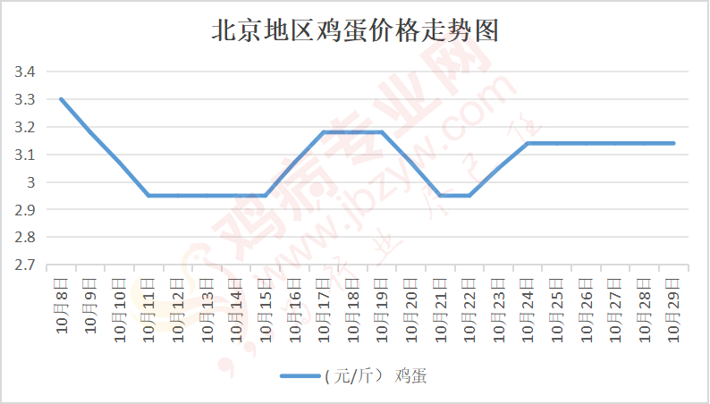 鸡病专业网消息:10月29日,北京大洋路鸡蛋主流批发价格138-139元/44斤,稳,到货7台,成交灵活,走货一般;回龙观鸡蛋138元/44斤,稳;顺义石门鸡蛋138元/44斤,稳。