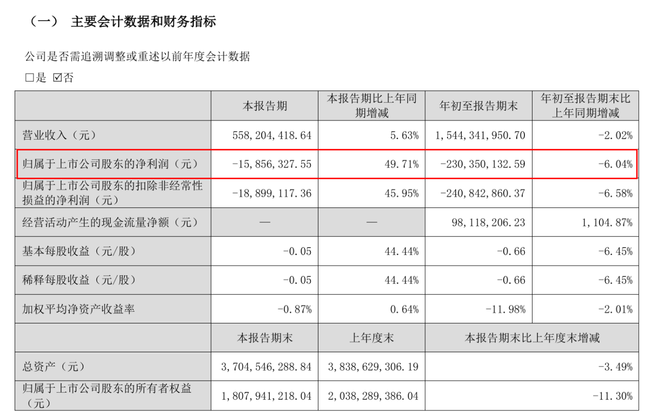 其中,第三季度,公司营业收入为5.58亿元,同比上升5.6%;归母净利润自去年同期亏损3153万元变为亏损1586万元。