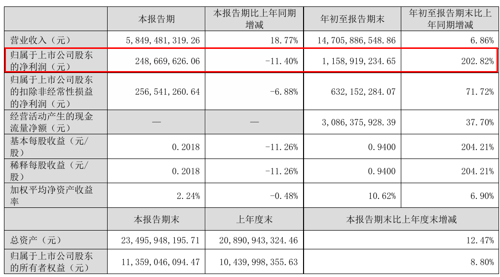 其中第三季度,公司营业收入259.37亿元,比上年同期减少9.76%;其中归属于上市公司股东的净利润17.81亿元,比上年同期减少65.02%;基本每股收益0.2678元/股,与上年同期减少65.11%。
