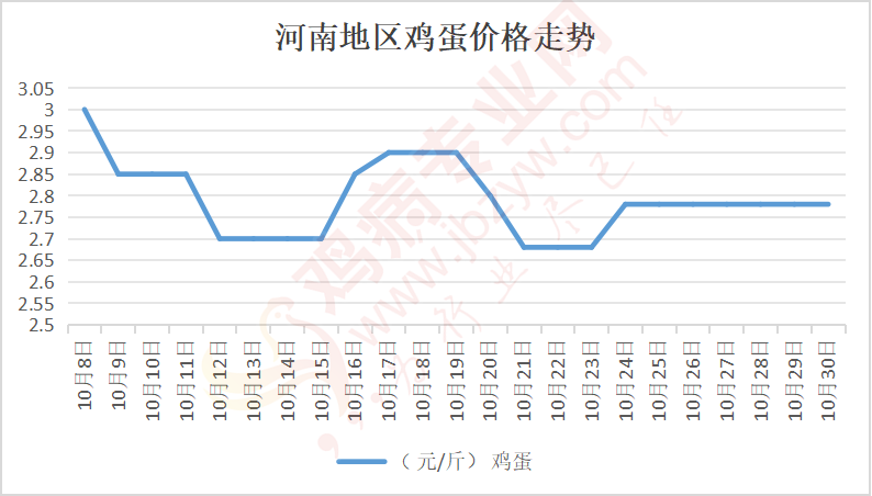 鸡病专业网消息:10月30日,河南郑州鸡蛋2.7元/斤,稳;新密鸡蛋2.7元/斤,稳;荥阳鸡蛋2.7元/斤,稳;中牟鸡蛋2.7元/斤,稳;周口鸡蛋2.65元/斤,稳;商丘鸡蛋80-81元/30斤,稳;鹤壁鸡蛋2.65元/斤,稳;汝州鸡蛋2.65元/斤,稳;开封鸡蛋80-81元/30斤,稳;漯河鸡蛋2.65元/斤,稳;漯河临颍鸡蛋2.65元/斤,稳;许昌鸡蛋2.7元/斤,稳;南阳鸡蛋2.65元/斤,稳;南阳邓州鸡蛋2.65元/斤,稳;新乡鸡蛋2.65元/斤,稳;安阳鸡蛋2.65元/斤,稳;新郑鸡蛋2.7元/斤,稳;登封鸡蛋2.7元/斤,稳;平顶山鸡蛋2.7元/斤,稳;驻马店鸡蛋2.7元/斤,稳;三门峡鸡蛋2.7元/斤,稳;焦作鸡蛋2.65元/斤,稳;信阳鸡蛋2.65元/斤,稳;濮阳鸡蛋2.65元/斤,稳。